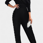 Un diseño elegante que equilibra comodidad y estilo con un toque atrevido. Este mono presenta un escote asimétrico con hombro descubierto, decorado con perlas, y un corte relajado que estiliza la figura sin esfuerzo. Ideal para eventos de noche o cenas elegantes.