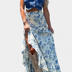 Un diseño con esencia sureña que combina feminidad y libertad. Kala se presenta en una silueta fluida con un estampado floral azul sobre fondo blanco roto, ideal para un día al aire libre o un look bohemio moderno. El corte favorecedor de talle alto se complementa con volantes delicados y una abertura lateral que aporta movimiento y carácter.