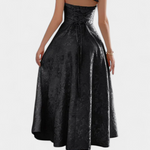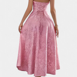 Sofisticación con actitud para brillar con estilo en cada ocasión. El vestido Gilda combina la textura lujosa del jacquard con una silueta femenina y detalles audaces. Su escote profundo y la espalda descubierta con lazo ajustable realzan la figura con elegancia y carácter.