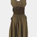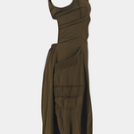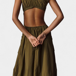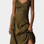 El vestido Katana fusiona estética funcional y feminidad con una silueta moderna. Su corsé estructurado con escote barco contrasta con una falda burbuja de volumen dinámico, ideal para un look urbano con intención. Los bolsillos cargo y el cierre frontal aportan un toque utilitario sin renunciar al estilo.