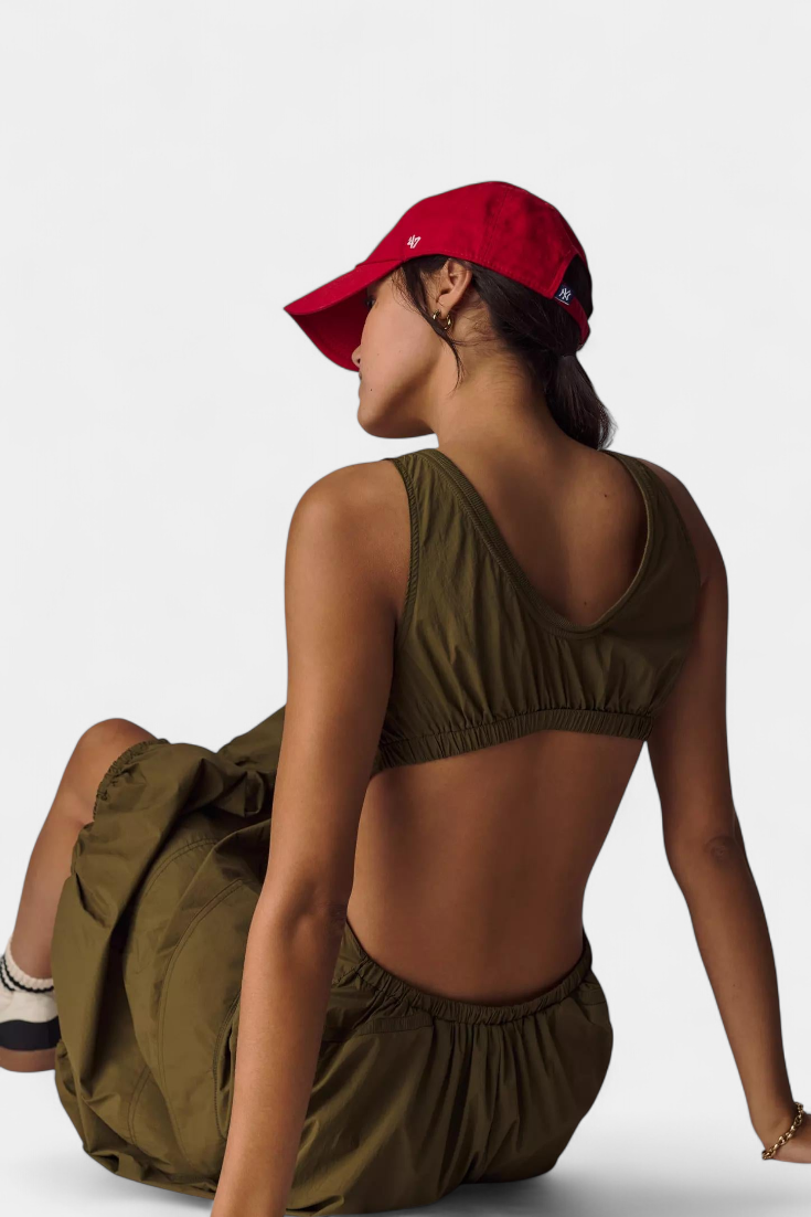 • Detalles: Escote barco, espalda abierta, bolsillos inclinados + cargo, cierre frontal