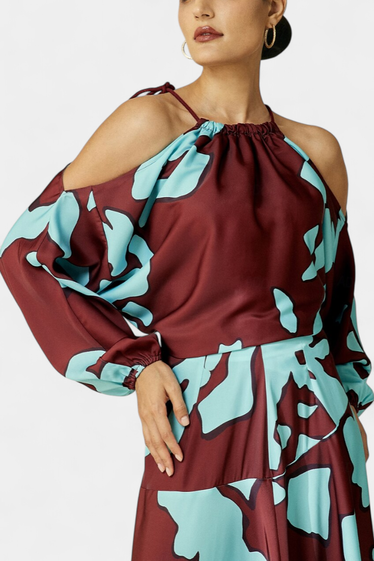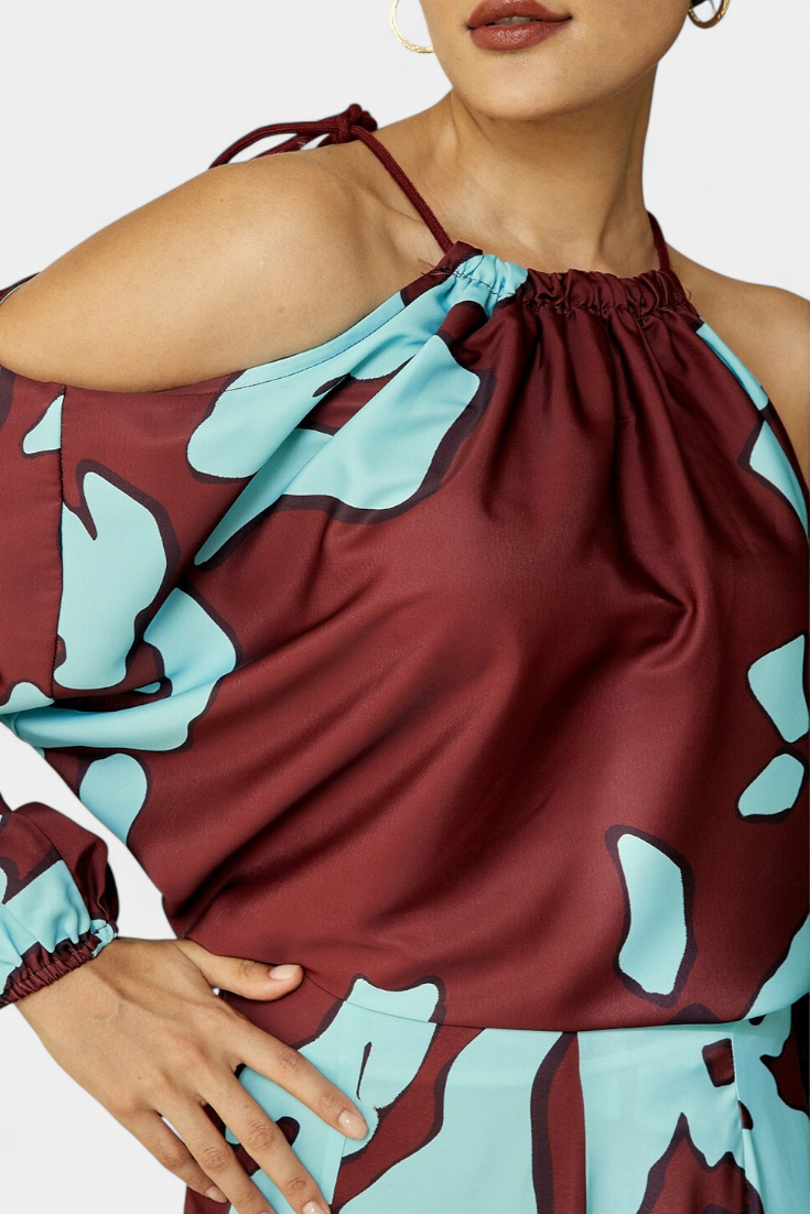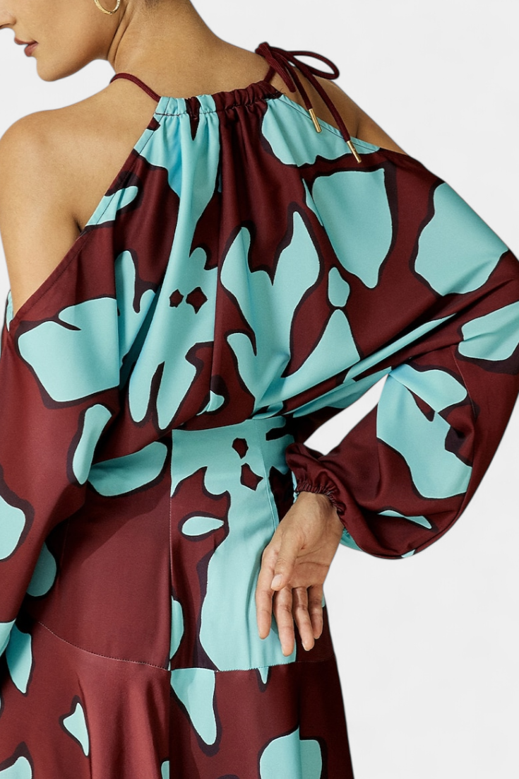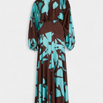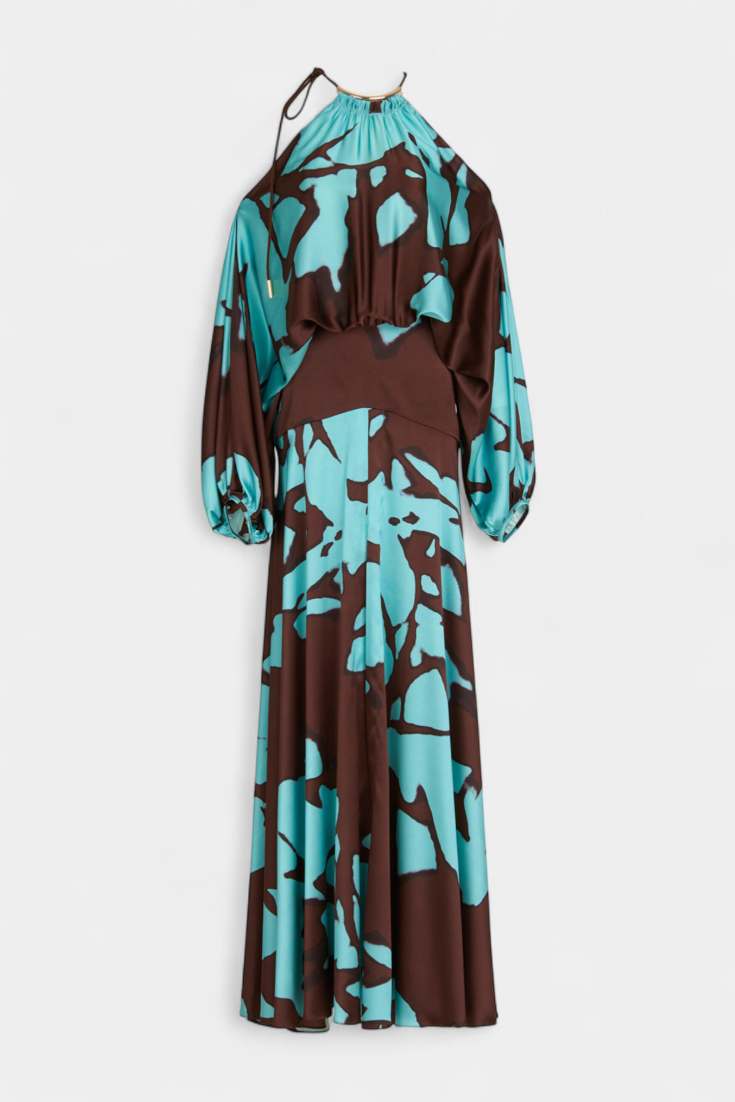Elegancia etérea con un giro contemporáneo. El vestido Monte destaca por su silueta vaporosa, mangas con abertura y un estampado abstracto en tonos contrastantes que atrapa la luz con cada movimiento. Su escote con detalle metálico y cintura entallada crean una figura estilizada con carácter y sofisticación.